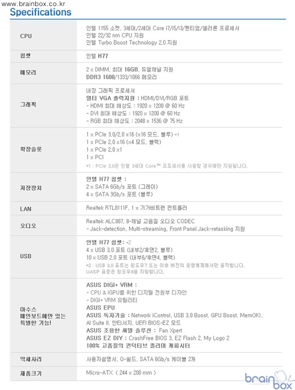 ASUS P8H77-M LE 메인보드는 다양한 시스템 보호기능과 함께 인텔 7시리즈 메인보드들에 채용된 최신 기술들이 적용되어 업그레이드는 물론 새 PC를 꾸밀 경우에도 효과적인 제품이다.