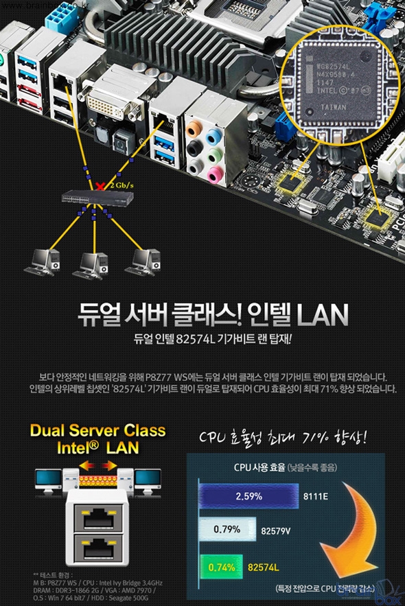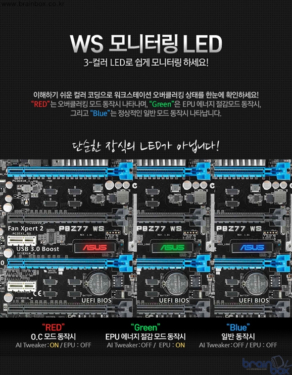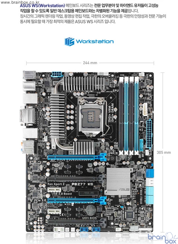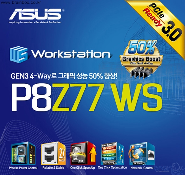 ASUS P8Z77 WS 메인보드는 전문적인 작업에 어울리는 강력한 기능을 자랑하는데 GEN3 4-Way 그래픽카드 지원 , 서버클래스 인텔 82574L 듀얼 기가비트 랜 , LED 시스템 모니터링 기능 등이 대표적인 예이다.