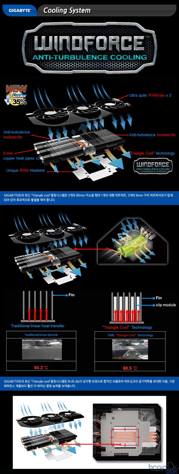 GIGABYTE社의 대표 아이콘 WINDFORCE 쿨링시스템을 더욱 발전시킨 Triangle Cool 시스템이 장착된 GIGABYTE GeForce® GTX680 WINDFORCE-3X 제품은 기존 레퍼런스 쿨러가 장착된 제품과 비교하여 약 +35%이상 향상된 냉각 성능을 제공하고 있다. GIGABYTE社의 최신 쿨링 시스템인 “Triangle cool”은 fin과 clip이 삼각형 모양으로 합쳐진 모듈로써 히트싱크의 공기역학을 최대한 이용, 기류의 흐름을 기판 및 GPU에 효과적으로 전달함으로써 기존 레퍼런스 제품보다 뛰어난 쿨링 성능을 보여준다. 또한 8mm 트리플 구리 히트 파이프가 방열핀을 통과하며 GPU에 직접 닿는 Direct touch방식을 사용 효과적으로 발열을 제어한다.