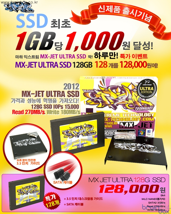 미니 컴퓨팅 선두기업 (주)비아코에서 마하익스트림 MX-JET ULTRA SSD 신제품 출시기념 특가행사인 MX-JET ULTRA SSD 128GB 128개를 128,000원에 진행 한다고 밝혔다. 마하익스트림 MX-JET ULTRA 120GB는 SMI-2244 컨트롤러를 탑재하고 SATA2 인터페이스를 채용하여 읽기속도 최대 270MB/s, 쓰기속도 최대 180MB/s로 작동하는 제품이다. 이 제품은 MLC 타입 동기식 NAND가 장착되어 있다.