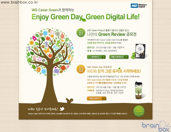 기업 웨스턴디지털코리아 (지사장 조원석, 이하WD코리아)은, 4월 22일 ‘지구의 날’을 기념해 그린데이 프로모션을 실시한다. WD코리아는 친환경 저전력 제품 WD 캐비어 그린 (WD Caviar® Green™)을 활용한 다양한 아이디어 및 유용한 정보를 공유하는 사용자들 가운데 추첨을 통해 뉴 아이패드 32GB 와이파이 전용 제품 및 WD 마이북 에센셜 1TB (WD My Book® Essential™), WD 캐비어 블랙 1TB (WD Caviar Black™) 등을 증정한다. 본 이벤트는 5월 13일까지 진행되며, 웹사이트 www.wdkoreaevent.co.kr 에서 참가할 수 있다. WD코리아는 또한 4월 22일부터 5월 6일까지 2주간 WD 캐비어 그린 구매 고객 중 시리얼 번호를 등록한 선착순 1,000명에게 WD 그린 텀블러를 제공한다. 본 이벤트는 웹사이트 http://www.wdkoreaevent.co.kr 혹은 http://www.wdthepowerofchoice.com/promotions/korea-promotions 에서 참가할 수 있으며, WD공식 트위터 www.twitter.com/wd_korea 에서도 확인할 수 있다. WD는 3.5인치 데스크톱 내장형 제품군에 고유의 컬러 마케팅인 BGB를 적용해 안정적인 컴퓨팅 환경을 지원하는 캐비어 블루와 저발열, 저소음의 친환경 모델인 캐비어 그린, 빠른 속도와 최고 수준의 기술적인 완성도를 갖춘 캐비어 블랙 제품을 제공한다. 이 가운데 특히 캐비어 그린은 최대 3TB의 용량까지 제공되는 모델로 드라이브 작동에 최소한의 전력만을 소모하도록 설계되어 있으며 특히 소음과 발열 부문에서 큰 이점을 제공해 에너지 절약을 실천하고자 하는 사용자들에게 많은 사랑을 받아왔다. WD코리아의 조원석 지사장은 “웨스턴디지털은 저장장치 시장을 선도해온 기술 기업으로서 자원의 소중함이 그 어떤 것보다 중요한 가치를 지닌 것을 누구보다 잘 알고 있다. 최고의 기술력이 곧 자원 절약의 가장 좋은 방법이므로, 앞으로도 우수한 제품을 통해 지구 환경 보존에 앞장설 것이다”고 말했다. ![]() |