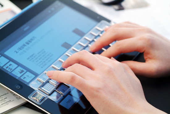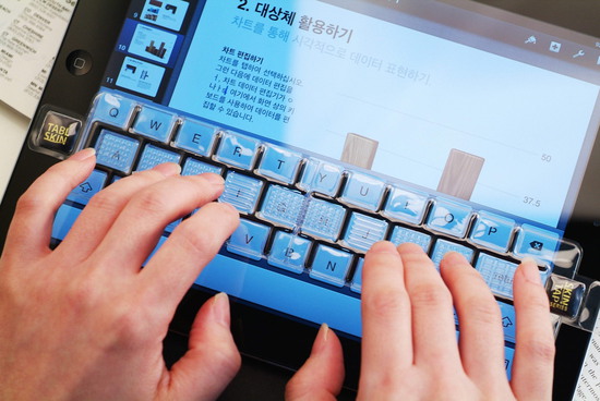 ▲ 아이패드 위에 투명한 우레탄 소재의 태블스킨 키보드 올려 놓으면 쉽게 타이핑할 수 있다.