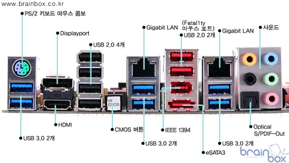 뿐만 아니라, 6개의 SATA3 커넥터와 4개의 SATA2 커넥터, 8개의 USB 3.0 포트와 10개의 USB 2.0 포트, IEEE 1394 포트를 장착해 확장성을 높이고, 게이머들을 위해 백패널에 별도로 탑재한 Fatal1ty 마우스 포트는 미세한 마우스 감도까지 조절해주어 최상의 게임환경을 제공해준다.