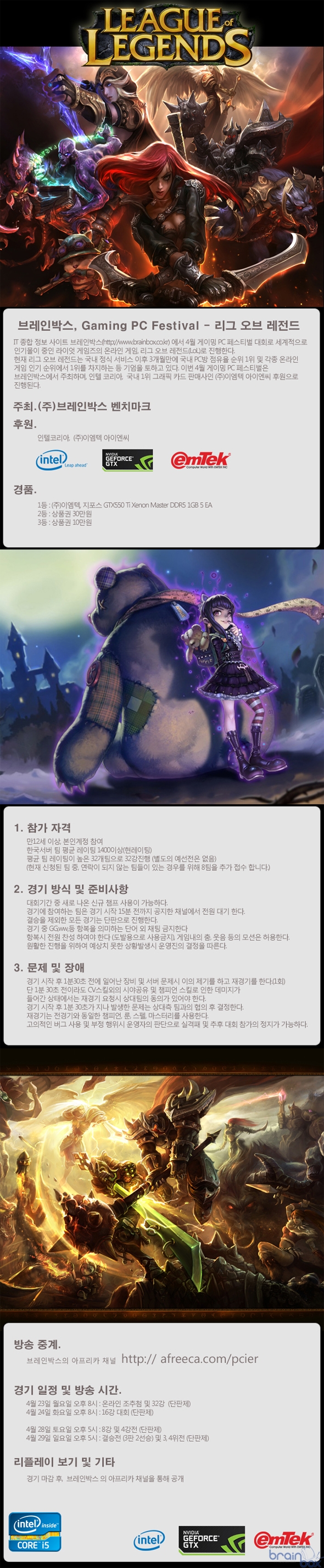 IT 종합 정보 사이트 브레인박스(http://www.brainbox.co.kr) 에서 4월 게이밍 PC 페스티벌 대회로 세계적으로 인기몰이 중인 라이엇 게임즈의 온라인 게임, 리그 오브 레전드(LoL)로 진행한다. 현재 리그 오브 레전드는 국내 정식 서비스 이후 3개월만에 국내 PC방 점유율 순위 1위 및 각종 온라인 게임 인기 순위에서 1위를 차지하는 등 기엄을 토하고 있다. 이번 4월 게이밍 PC 페스티벌은 브레인박스에서 주최하며, 인텔 코리아, 엔비디아 코리아, 및 국내 1위 그래픽 카드 판매사인 (주)이엠텍의 후원으로 진행된다. 참가 신청은 만 12세 이상 본인 계정을 갖고 있는 누구나 5명이 한 팀을 이루어 신청이 가능하며, 한국 서버를 기준으로 팀 평균 레이팅이 1,400 이상 이어야만 신청이 가능하며, 4월 초에 미리 신청된 팀들과 오는 4월 20일 부터 22일 오후 1시까지 신청한 2차 팀으로 총 32강 32팀을 선착순으로 마감되었다.