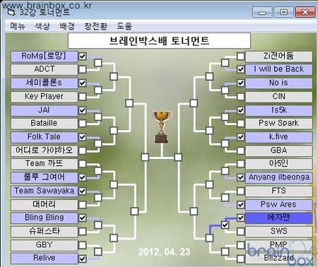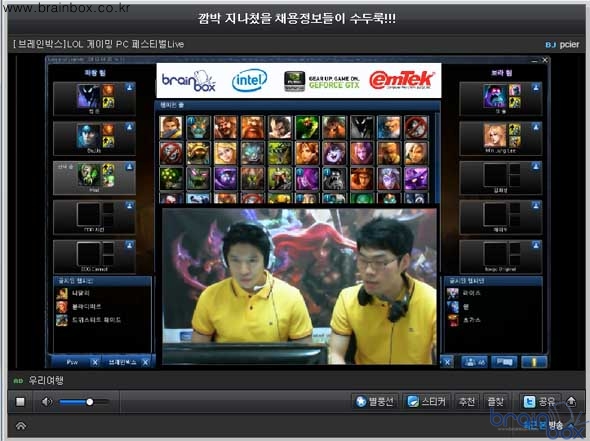 IT 종합 정보 사이트 브레인박스(http://www.brainbox.co.kr) 에서 4월 게이밍 PC 페스티벌 대회로 세계적으로 인기몰이 중인 라이엇 게임즈의 온라인 게임, 리그 오브 레전드(LoL)로 진행하고 있다. 어제 선착순을 모집된 32강 팀들 중에서 단판제를 통해 16강 대진표가 완성이 되었다. 16강은 4월 24일 오후 8시 부터 시작이 될 예정이며, 단판제를 통해 8강 진출 팀을 뽑는다. 현재 진행되고 있는 4월 게이밍 PC 페스티벌은 브레인박스에서 주최하며, 인텔 코리아, 엔비디아 코리아, 및 국내 1위 그래픽 카드 판매사인 (주)이엠텍의 후원으로 진행된다. 참가 신청은 만 12세 이상 본인 계정을 갖고 있는 누구나 5명이 한 팀을 이루어 신청이 가능하며, 한국 서버를 기준으로 팀 평균 레이팅이 1,400 이상 이어야만 신청이 가능하며, 4월 초에 미리 신청된 팀들과 오는 4월 20일 부터 22일 오후 1시까지 신청한 2차 팀으로 총 32강 32팀을 선착순으로 마감되었다.