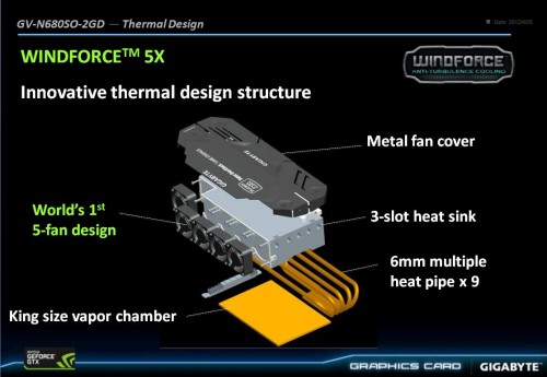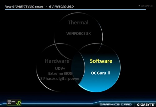 슈터 오버 설계 디자인, 윈드포스-5X 기술 탑재로 퍼포먼스를 급상승시킨 지포스 GTX680 SOC. 본 제품은 소음, 발열, 온도를 낮춰 전체적인 성능을 끌어 올린 것이 특징. 60도 이하에서 최대 35db 정도로 소음이 적고, 전파 방해를 줄여주는 Proadlizerx4를 탑재, 오버클럭시 안정성까지 높였다. 듀얼 바이오스 기술이 채용돼 버튼 하나로 손쉽게 오버클럭 할 수 있다는 특징이 있다.