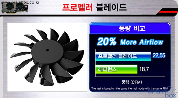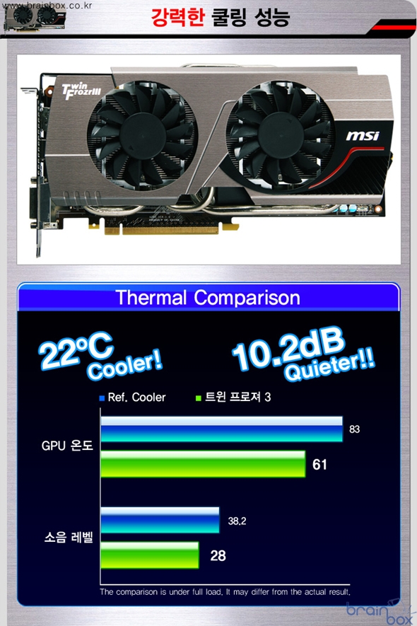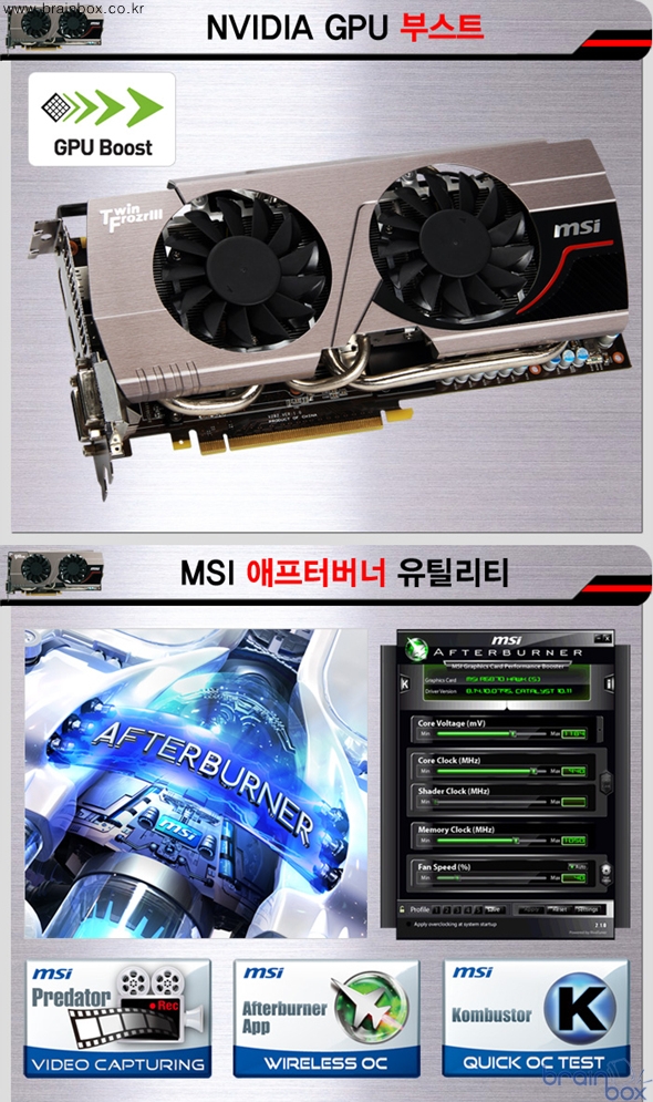 ![]() 세계 최고의 VGA 제조 기술력을 갖춘, MSI의 한국 공식 디스트리뷰터인 ㈜웨이코스(대표:고민종)가 한국 최초로 듀얼 쿨링 시스템을 장착한 “MSI N680GTX 트윈 프로져 3 2GD5/OC” 그래픽카드를 출시하였다. MSI N680GTX 트윈 프로져 3 2GD5/OC 제품은 최신 28nm 미세 공정의 NVIDIA ‘케플러’ 아키텍처 기반으로 1536개의 CUDA 코어를 내장하고 있고 1058MHz로 동작하는 GPU 및 6008 Gbps 스펙의 차세대 GDDR5 2GB 메모리를 제공한다. 최신 PCI Express 3.0 규격 지원 ![]() MSI N680GTX 트윈 프로져 3 2GD5/OC 제품은 최신 인터페이스인 PCI Express 3.0 공식 지원한다. 최신 PCI Express 3.0 인터페이스는 기존 PCI Express 2.0 규격보다 2배 더 많은 대역폭(32GB/s)을 제공할 수 있으며, 최신 Gen3를 지원하는 메인보드와 곧 출시될 차세대 아이비브릿지 CPU를 통해 구현될 수 있다. 강력한 트윈 프로져 3 쿨링 시스템 ![]() MSI N680GTX 트윈 프로져 3 2GD5/OC 제품은 레퍼런스 제품보다 더욱 강화된 성능을 제공하는 “트윈 프로져 3” 쿨링 시스템을 장착한 제품이다. 트윈 프로져 3 쿨링 시스템은 MSI가 자체 개발한 고유의 쿨링 솔루션으로서, 레퍼런스 쿨러보다 더욱 우수한 쿨링 성능을 제공한다. ![]() MSI 트윈 프로져 3 쿨링 시스템은 8cm 듀얼 팬을 장착하여 그래픽 카드의 발열량을 신속하게 제거할 수 있다. GPU의 발열량을 신속하게 히트싱크로 전달하기 위하여 5개의 히트파이프를 장착하고 있으며, 5개의 히트파이프 중 2개는 업계 최대 사이즈인 “8mm 슈퍼파이프” 로 구성하여 더욱 빠르고 신속하게 GPU 발열량을 제거할 수 있다. ![]() MSI 트윈 프로져 3 쿨링 시스템에는 기존 팬보다 성능이 향상된 “프로펠러 블레이드” 타입의 팬이 장착된다. 프로펠러 블레이드는 VGA에 더 많은 풍량을 제공하기 위해 MSI VGA 엔지니어링 팀이 연구끝에 개발해 낸 독창적인 디자인의 팬으로써, 팬 날개 디자인 변경을 통해 기존 팬 보다 20% 더 많은 풍량을 히트싱크 및 VGA 기판에 공급할 수 있다. ![]() MSI N680GTX 트윈 프로져 3 2GD5/OC 제품은 메모리 / 전원부 및 기판 전체의 발열량을 흡수하여 제거하는 “일체형 히트싱크” 를 장착하여, 오버클러킹 환경에서도 낮은 기판 온도를 유지시켜 준다. 아울러 일체형 디자인으로 인해 쿨러의 장력으로 인한 “기판 휨 현상을 방지” 해주는 추가적인 장점 역시 기본 제공 한다. ![]() MSI N680GTX 트윈 프로져 3 2GD5/OC 제품은, 8cm 듀얼 팬 / 프로펠러 블레이드 / 5개 히트파이프 / 8mm 슈퍼파이프 / 일체형 히트싱크 디자인을 통해 레퍼런스 제품보다 22℃ 더 시원하고 10.2dB 더 조용한 특징을 제공한다. NVIDIA GPU 부스트 기술과 MSI 애프터버너 튜닝 유틸리티 제공 ![]() MSI N680GTX 트윈 프로져 3 2GD5/OC 제품은 NVIDIA GPU 부스트 기술을 통해, 3D 게임의 특성과 그래픽 연산 부하에 따라 GPU 클럭을 자동적으로 높여주어 더욱 향상된 3D 가속 성능을 제공한다. MSI N680GTX 트윈 프로져 3 2GD5/OC 사용자는 MSI 애프터버너 오버클러킹 유틸리티를 통해 직접 GPU/메모리 클럭을 조절할 수 있어, 잠재된 그래픽카드 오버클럭 능력을 최대한 발휘할 수 있게 만들어 줄 수 있다. 게이머는 애프터버너 유틸리티 안에 포함된 프레데터(Predator) 기능을 통해 자신의 게임 플레이 화면을 실시간으로 동영상 캡쳐를 할 수 있어 더욱 다양한 방식으로 게임을 즐길 수 있으며, 애프터버너 앱을 사용할 경우 iOS와 안드로이드 기반의 모바일 기기를 통한 애프터버너 기능의 무선 원격 조정이 가능하여, 다양한 방식으로 VGA 오버클러킹 및 모니터링이 가능한 특징을 제공한다. ![]() 또한 애프터버너로 오버클럭을 한 뒤에, 안정적으로 동작하는 지 사용자가 직접 확인할 수 있는 “쿰버스터(Kombustor)” 유틸리티를 함께 제공하여, 최적의 OC 클럭을 찾아낼 수 있도록 지원하고 있다. 3D Vision Surround 지원 ![]() MSI N680GTX 트윈 프로져 3 2GD5/OC 제품은 NVIDIA 3D Vision Surround 기술을 통해 단일 그래픽카드로 3개의 3D 디스플레이 출력을 지원하여 사실적인 3D 화면을 제공하며, 2D 화면을 포함하여 최대 4개까지 모니터를 연결할 수 있어 멀티 디스플레이 환경에 적합한 최적의 기능성을 제공한다. 고품질 All 솔리드 캐패시터 장착 ![]() MSI N680GTX 트윈 프로져 3 2GD5/OC 제품은 전체 기판에 고품질 솔리드 캐패시터를 채택하여 더욱 안정하고 단단한 품질을 제공한다. 본 제품에 장착된 고품질 솔리드 캐패시터는 풀로드 상태를 기준으로 10년이라는 긴 수명을 제공하며, ESR 특성 부분에서도 기존 솔리드 캐패시터보다 30% 낮은 특성을 제공한다. ※ MSI N680GTX 트윈 프로져 3 2GD5/OC 공식 스펙 ![]() ※ 가격 정보 : http://blog.danawa.com/prod/?blogSection=2&prod_c=1655628 MSI 공식 한국 디스트리뷰터인 ㈜웨이코스가 국내에 유통하는 MSI 그래픽카드는 타사 저가형 VGA 와 차별화된 3년 무상 A/S 를 제공하며, 제품에 대한 더욱 자세한 내용은 웨이코스 홈페이지 (http://www.waycos.co.kr / 02-712-8999)을 참조하면 된다. |