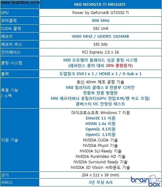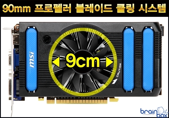 - 90mm 프로펠러 블레이드 싱글 팬 쿨링 시스템 세계 최고의 VGA 제조 기술력을 갖춘, MSI의 한국 공식 디스트리뷰터인 ㈜웨이코스(대표:고민종)가 NVIDIA 지포스 GTX 550 코어를 장착하고 MSI 프로펠러 블레이드 쿨링 시스템을 장착한 “MSI N550GTX-Ti MD1GD5” 그래픽카드를 출시했다.