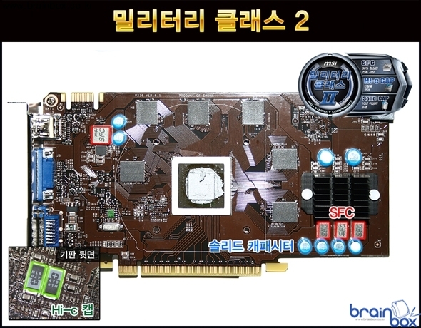 밀리터리 클래스 2 디자인 MSI N550GTX-Ti MD1GD5 그래픽 카드는 MSI 밀리터리 클래스 2 디자인을 채택하여 더욱 강력하고 단단한 품질을 제공한다. 탄탈륨 코어를 기반으로한 HI-c CAP과 SFC (슈퍼 페라이트 초크) 그리고 고품질 솔리드 캐패시터로 구성된 밀리터리 클래스 2 부품들은 우수한 품질과 내구성으로 미국방성 품질 기준의 안정성을 테스트하는 IST 전문 연구기관의 품질 인증을 받은 부품들이다.