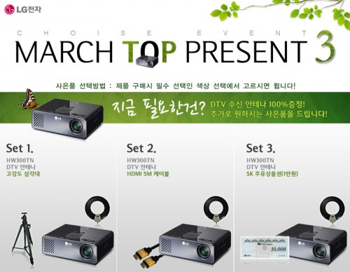 이번 이벤트는 소비자의 입맛에 맞춰 사은품을 선택할 수 있는 것이 특징.프로젝터를 고정시켜 원하는 높이와 각도로 줄 수 있는 삼각대 또는 다양한 기기와 연결할 때 꼭 필요한 HDMI 5M 케이블, 그리고 고유가 시대에 도움을 줄 SK주유상품권 중 하나를 고르면 된다.