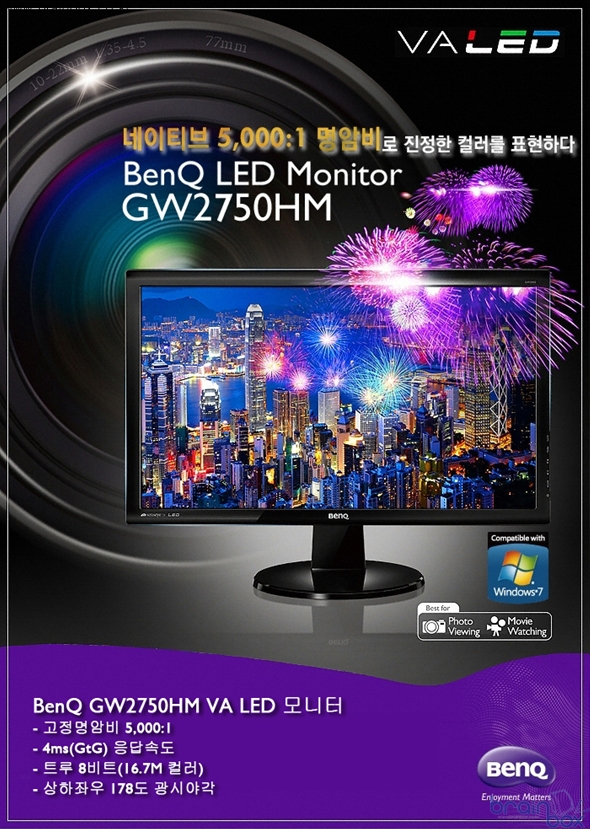 GW2250HM, 24형 제품인 GW2450HM 그리고 27형의 GW2750HM 등 세개의 모델이 포함된다. 벤큐는 GW 시리즈를 위해 아주 특별한 패널을 채택하여 경쟁력을 높였다. 벤큐 그룹 내 계열사인 AUO가 개발한 최신 A-MVA 패널이 바로 그 것. 이 최신 A-MVA 패널은 국내에서 판매되고 있는 VA 패널 및 광시야각 제품 중 가장 빠른 응답속도(4ms)를 제공한다. 때문에 6ms 혹은 그보다도 느린 응답속도의 일반 VA 패널이나 IPS 패널 제품보다 훨씬 빠르고 안정된 화면을 보장한다. 또, 상하좌우 178도에 달하는 광시야각을 제공한다. 응답속도 혹은 시야각 중 하나는 포기할 수 밖에 없었던 소비자에게 희소식이다. ![]() 벤큐 GW 시리즈의 최신 A-MVA 패널의 고정명암비는 5천대 1로, 일반 모니터와 비교하여 최대 5배 높은 수치이다. 또한 트루 8비트 컬러 구현으로, 일반 6비트 패널 대비 64배나 높은 색상 재현력을 보여준다. 때문에 화면을 더욱 깊이있는 색상으로 채워줄 뿐 아니라, 영상이나 이미지가 가진 고유의 색을 그대로 보여준다. 장시간 사용해도 눈이 편안한 이유다. 벤큐 GW 시리즈 모니터는 화사하고 선명한 영상을 제공하면서도 전력 소모가 적은 LED 광원을 채택했고, HDMI 및 DVI와 D-SUB 단자와 두개의 2와트 스피커까지 갖추었다. HDMI 단자를 통해 셋톱박스에 연결하면 TV 시청도 가능하며, 그 밖에 콘솔게임기 등 다양한 디지털 기기에 연결하여 활용할 수 있다. 소윤석 벤큐코리아 지사장은 "벤큐는 일반 소비자 뿐 아니라 사진이나 영상 관련 전문가들을 위한 최상의 조건을 제공하고자 노력해왔다."며, "이번에 출시한 GW 시리즈는 개인 소장 영화나 사진 그리고 온라인을 통한 영상과 이미지 감상에 최고의 결과물을 보여줄 것"이라고 밝혔다. 벤큐코리아는 먼저 27형의 GW2750HM 모델을 33만 9천원에 판매하기로 하고, 22형 및 24형 모델은 생산 일정에 따라 순차적으로 시장에 내놓을 예정이다. 구입 후 1년간 무상 보증 및 방문 픽업 서비스가 제공되며, 무결점 정책에 따라 구매 직후 불량 화소 발견시 신품으로 교환받을 수 있다. 제품 및 서비스에 관한 보다 자세한 내용은 벤큐코리아 홈페이지에서 얻을 수 있다. ![]() |