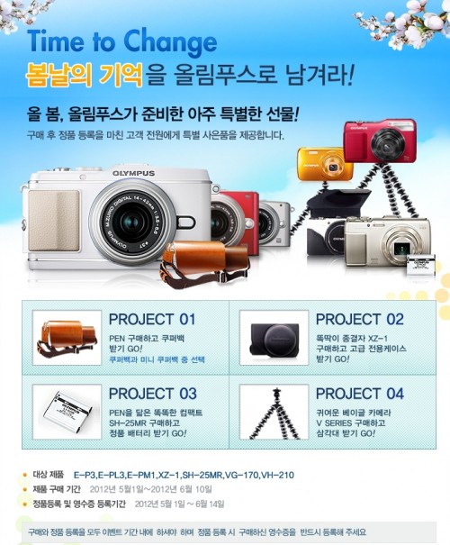 ‘Change Timing! 봄날의 기억을 올림푸스로 남겨라’ 는 캠페인 명으로 진행되는 이번 이벤트는 행사 기간 내 해당 제품을 구매하고 6월 14일(목)까지 정품등록을 마친 고객에게 100% 사은품을 증정하는 행사로, 가정의 달 선물용이나 봄날 출사를 위해 카메라 구입을 고민했던 고객들에게 희소식이 될 것으로 보인다.