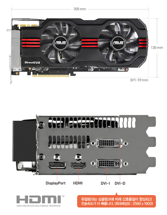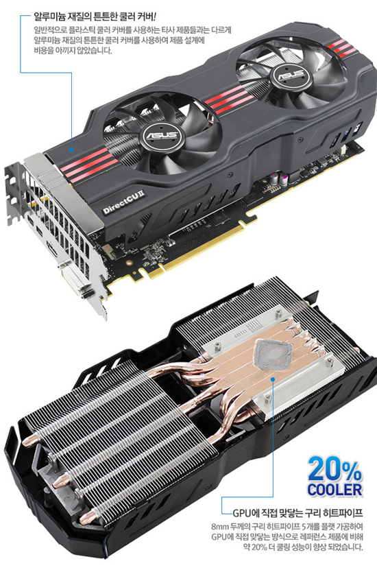 ASUS ENGTX680 TOP 2GB DC2 그래픽카드는 5개의 대형 플랫 히트파이프 적용과 함께 듀얼 쿨링솔루션인 ASUS 다이렉트 CU2 솔루션이 채용되었으며 강력한 확장포트 설계와 발열제어를 위해서 3슬롯 설계를 갖춘 제품이다.