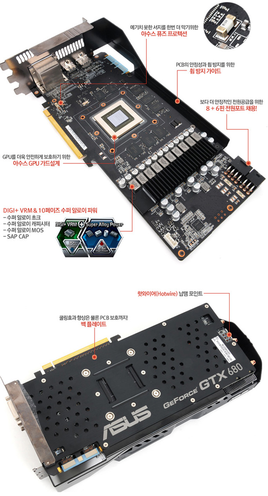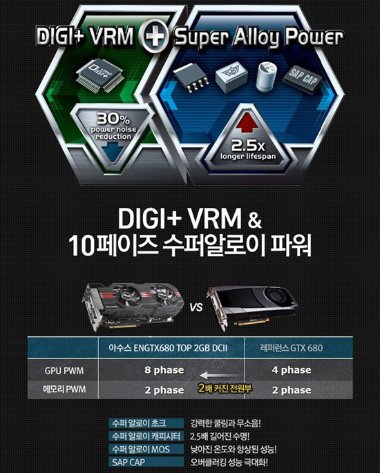 ASUS ENGTX680 TOP 2GB DC2 은 차세대 디지털 전원부인 10페이즈 Digi+ VRM이라는 강력한 전원 부 설계와 함께 수퍼알로이 초크 설계 및 VGA 핫 와이어 설계등 최상위급 설계가 대부분 적용되었다.
