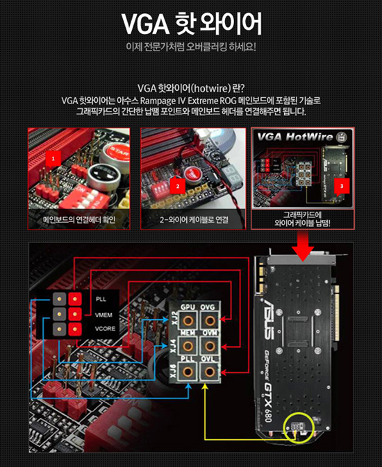 또한 프로 급 사용자들을 위하여 일반적인 소프트웨어 방식이 아닌 하드웨어 적인 방식으로 추가전압을 인가 오버클러킹 폭을 향상시킬 수 있는 VGA 핫 와이어 기능도 지원한다.