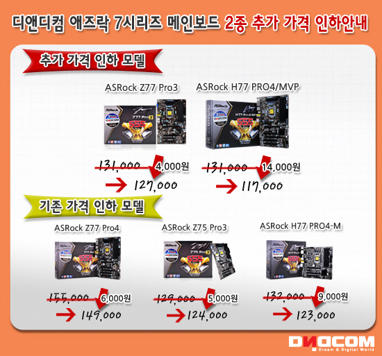 기존 정가인 13만 1000원에서 12만 7000원으로, 'ASRock H77 Pro4/MVP'는 기존 정가인