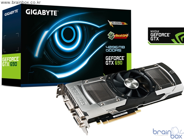 선택받은 자의 Item, GIGABYTE에서 먼저 선보입니다! 작년에 선보였던 듀얼 GPU 솔루션, GIGABYTE GeForce® GTX590 제품에 이어 완벽하게 세대교체가 이루어진 GIGABYTE GeForce® GTX690 제품은 28nm 공정의 Kepler 코어(GeForce® GTX680 GPU)가 NVIDIA SLI™ 기술에 힘입어 단일 PCB에 듀얼로 탑재되어 있으며 각 GPU당 1,536개의 CUDA 코어가 병렬로 연결되어 있어 현존 최고의 그래픽 성능을 보여준다. GIGABYTE GeForce® GTX690 제품은 28nm 공정의 Kepler 코어(GeForce® GTX680 GPU)의 장점인 GPU Boost 기술이 반영되어 최대 소비 전력 범위(TDP) 내에서 코어 및 메모리의 동작클럭과 동작전압이 자동으로 조절되므로 게이밍 환경에 따라 최대의 성능을 이끌어 낼 수 있다. 또한 이를 바탕으로 최대 소비 전력(TDP)을 300W까지 줄여서 그간 플래그쉽 제품들의 고질적인 문제였던 전력소비 문제까지 동시에 해결하였다. GIGABYTE GeForce® GTX690 제품은 10 power phase 디지털 전원부로 설계 되어 있다. 완벽하게 구성된 전원부를 통해 보다 안정적인 Boost clock 오버클러킹이 가능한 이 제품은 기본적으로 915MHz의 Core Base 클럭과 1,019MHz Core Boost 클럭이 적용되어 있으며 512bit 로 구성된 총 4.0GB의 GDDR5 메모리를 탑재하고 있어 4대의 모니터를 동시에 사용할 수 있는 NVIDIA 3D VISION Surround 기술을 별도의 장치 설정 없이 사용할 수 있다. 또한 OpenGL® 4.2 정식지원, 새로운 기법의 앤티앨리어싱 기술인 TXAA™, FXAA™ 지원을 통해 하이엔드 게이머 뿐만 아니라 전문적인 개발자들이 사용하는 3D 랜더링 작업에서도 탁월한 성능을 보여준다. 이 제품은 10 layer + 2oz copper PCB 설계기술로 디자인 되어 일반 PCB에 비해 2배의 구리 Layer를 함유, 시스템의 안정성을 최우선으로 고려하고 있으며 이노다이징 처리된 특수 PCB는 제품의 내구성을 보장한다. Vapoer Chamber(증기챔버)타입의 쿨링 시스템은 모세혈관 원리로 히트싱크의 열전도를 최대한 유도하며, 저-소음 쿨링팬이 동작하여 기류의 흐름을 기판 및 GPU에 효과적으로 전달한다. |