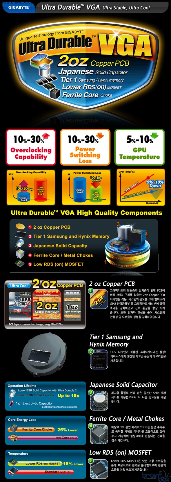 GIGABYTE GeForce® GTX670 제품은 GIGABYTE社가 자랑하는 2oz Ultra Durable VGA(이하:UDV) 설계기술로 디자인 되어 일반 PCB에 비해 2배의 구리 Layer를 함유, 시스템의 안정성을 최우선으로 고려하고 있다. 또한 최고 품질로 인정 받은 일본산 Solid 캐패시터 및 Low RDS MOSFET 을 사용함으로써 더 나은 전기적 특성을 가지고 있으며 효율적인 전력 분배를 통해 전류의 흐름을 원활하게 제공한다.