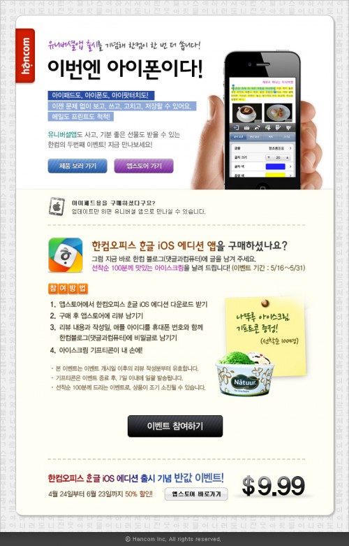 ‘한컴오피스 한글 iOS 에디션’ 유니버셜 앱은 앱스토어에서 19.99달러에 판매되며, 현재 출시 기념으로 6월 23일까지 9.99달러로 판매하는 50% 할인 프로모션이 진행 중이다. 이 밖에도 한컴은 유니버셜앱 구매 고객이 사용 리뷰를 앱스토어에 남기면 선착순 100명에게 나뚜루 기프티콘을 지급하는 등 다양한 출시 기념 이벤트를 진행한다.