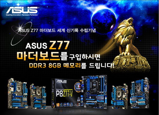해당 기간 동안 ASUS P8Z77-V 모델을 구입하면 삼성 DDR3 8GB 메모리 (4GB X 2)를, ASUS P8H77-V, ASUS P8H77-M LE, P8B75-V, P8B75-M LE 모델을 구입하면 삼성 DDR3 4GB 메모리를 증정한다. 이번 이벤트를 통해 소비자들은 2012년에도 PC 오버클럭킹의 역사를 새로 쓴 ASUS의 Z77 및 H77 마더보드의 뛰어난 오버클럭킹 능력과 안정성을 다시 한번 체험할 수 있는 좋은 기회를 얻게 되었다.