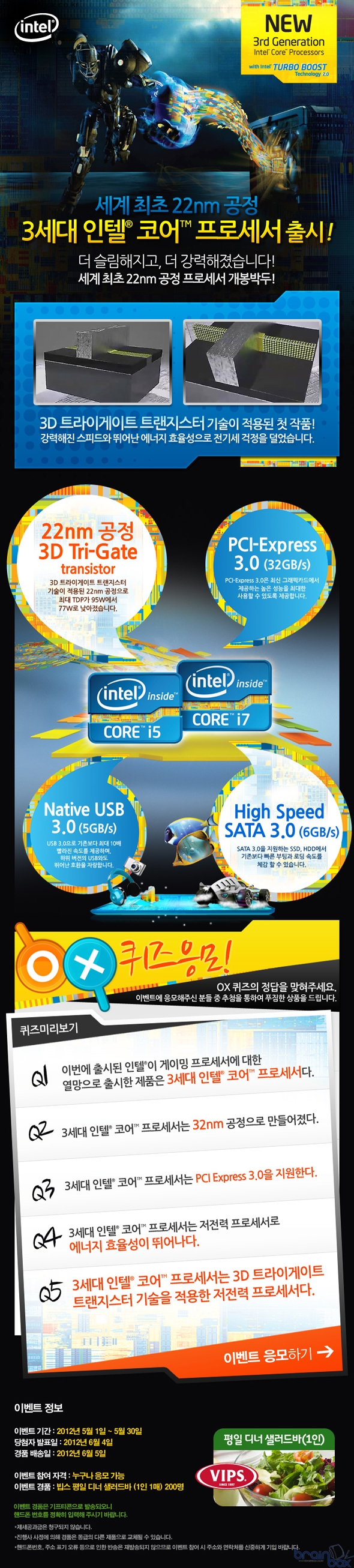 또한 22nm 공정 고도화 외에도 각종 규격의 ‘3.0’ 버전을 두루 지원해 하이엔드 영역에서 차츰 영역을 넓히던 차세대 기술들을 대중화시키는 역할을 맡고 있다. 특히 카드 형태의 차세대 주변기기를 쓰게 해주는 "PCI Express 3.0‘, 5GB/s 전송속도를 실현시킨 "USB 3.0", 스토리지 기기의 속도를 한 차원 높인 6GB/s 지원 "SATA 3.0" 등은 사용자의 PC 환경을 더욱 풍족하게 만들어준다. 이처럼 기술의 혁신을 우리의 PC에 접목시켜주는 3세대 인텔 코어 프로세서가 PC 사용자 모두에게 행운의 기회까지 제공해 눈길을 끌고 있다. 이미 3세대 인텔 코어 프로세서를 쓰고 있는 유저는 물론, 앞으로 3세대 인텔 코어 프로세서의 수혜를 입을 PC 유저 모두에게 혜택이 두루 돌아가는 OX 퀴즈 이벤트는 오는 5월 30일까지 응모자 전원에게 행운의 기회를 제공하게 된다. 퀴즈는 다섯 고개 형식으로 OX 퀴즈 이벤트를 진행하면 된다. 여기에서 물어보는 질문들은 3세대 인텔 코어 프로세서의 특징을 물어보는 쉬운 이벤트로, 인텔 프로세서에 대한 애정이 있는 사람이라면 누구나 맞출 수 있는 내용들로 이루어져 있다. 오는 6월 4일에 당첨자가 발표될 이번 이벤트에 걸린 경품은 패밀리 레스토랑 ‘빕스(VIPS)’의 평일 디너 샐러드바 이용권이다. 1인 1매가 제공되며, 모두 200명에게 행운의 기회가 제공된다. 기프티콘으로 전해지므로, 응모 시 핸드폰 번호를 정확히 입력해야 되니 이 부분을 주의하자. 이벤트 담당자인 최보경 마케터는 “인텔 프로세서의 뛰어난 역량을 한층 더 높인 3세대 인텔 코어 프로세서는 22nm 3D 트라이게이트 트랜지스터 기술공정 채택으로 TDP까지 77W로 줄여주는 저전력 프로세서로 에너지 효율성을 크게 높여줍니다. 또한 PCI Express, USB, SATA 모두 3.0 최신규격을 지원해 기술에 관심 많은 파워유저들에게도 호평을 받고 있습니다”라고 설명하고, “제품에 관심을 가지신 고객 여러분들에게 잠깐의 상식으로 행운의 기회를 나눌 수 있는 이번 퀴즈 이벤트에 많은 참여와 관심을 기대합니다”라고 덧붙였다. |