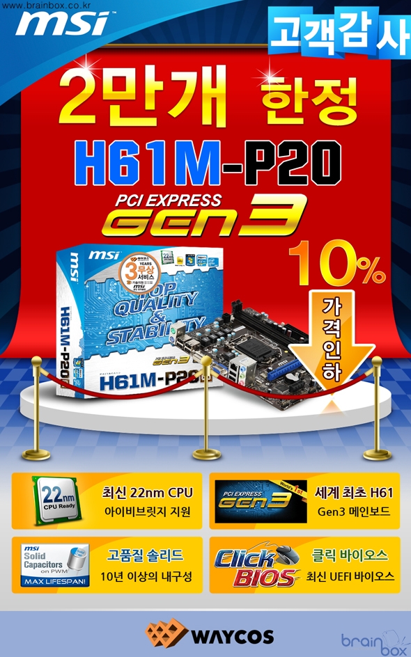 세계 정상급 토탈 IT 솔루션 제조사, MSI의 한국 공식 디스트리뷰터인 ㈜웨이코스(대표:고민종)가 MSI 메인보드를 사랑해주시는 한국 소비자들을 위하여 2만대 한정으로 MSI H61 메인보드를 10% 인하된 가격에 특별 판매한다고 밝혔다.