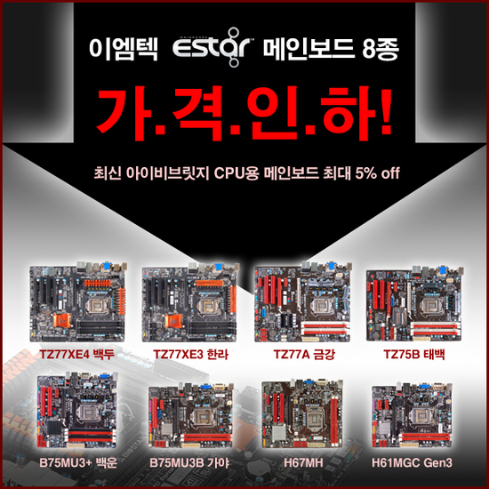 한편 이엠텍은 Z77 칩셋 메인보드 'ESTAR TZ77XE4 백두'와 'ESTAR TZ77XE3 한라' 구매시 잘만테크와 쿨러마스터의 CPU 쿨러를 반 값에 제공하는 특별행사도 벌이고 있다.