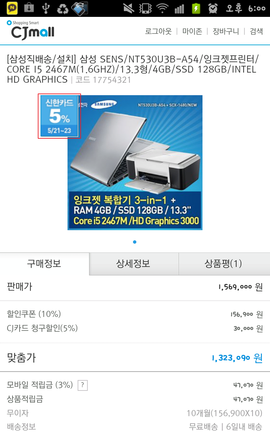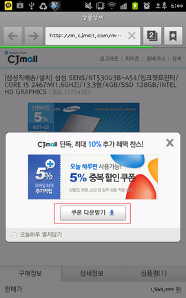 CJmall과 다나와가 함께 진행하고 있던 5% 추가 할인 쿠폰 행사가 바로 그것인데, 기존 5% 추가 할인 쿠폰은 인터넷 웹사이트를 통해 접속해야지만 쿠폰이 적용되고 모바일을 통해 접속하면 추가 할인 쿠폰이 제외되었었다. 그러나 5월 17일부터 모바일에서도 5% 추가 할인 쿠폰을 받을 수 있게 되었다.