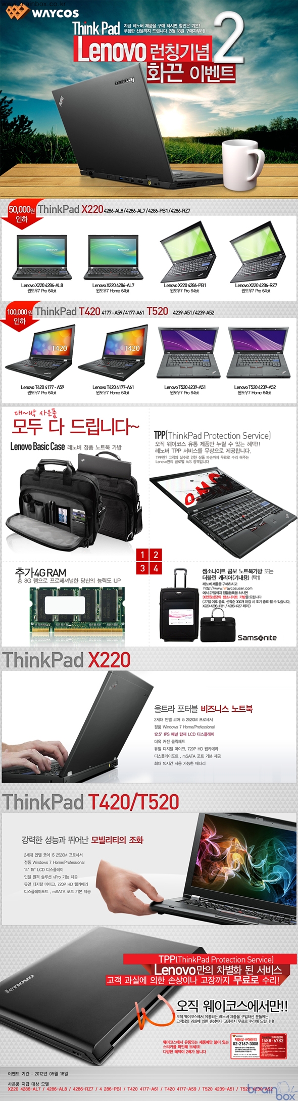 유통까지 더했다. - T520,T420 10만원 / X220 5만원 인하 , 추가 4G 메모리 및 정품 가방 등 총 4가지 증정 - TPP 프로그램으로 고객 과실에 의한 제품 파손도 100% 무상 서비스 기본 제공 - 30만원 상당의 샘소나이트 가방 증정 이벤트 전세계 2위 PC회사 Lenovo 공식파트너 ㈜웨이코스(대표:고민종)는 인기 상승중인 Lenovo X&T 3종 노트북의 가격인하 및 총 4가지 대박 사은품을 제공한다. Lenovo T520, T420 제품은 10만원 가격인하, X220 제품은 5만원 가격인하 와 함께 추가 4G 메모리와 정품 가방을 제공하고, TPP 무상 제공 , 5월27일까지 정품등록자에게는 30만원 상당의 샘소나이트 정품 가방을 제공해 노트북 구매 시 최대 5가지의 혜택과 사은품을 받을 수 있다. Lenovo 제품은 성능과 안정성으로 무장된 노트북으로 충격,방수,먼지에 매우 강력하게 설계되어 있어 일상 생활과 업무에서 쉽게 발생할 수 있는 충격과 파손에 의한 부담을 최소화했고, 다른 유통사 제품에서는 유료로 구매해야 하는, TPP(ThinkPad Protection) 기본제공으로 고객과실에 의한 제품 파손도 100% 무상으로 수리 받을 수 있는 프로그램을 무료로 제공한다. ![]() ThinkPad X220 제품은 12인치(1366*768) IPS 패널을 탑재했고, 2세대 인텔 코어i5 2520M 프로세서를 사용하고 있다. ThinkPad T420,T520 제품은 각각 14인치(1600*900),15인치(1600*900) 와 엔비디아 쿼드로 NVS 4200M 1G 제품을 탑재했다. 모든 Lenovo 제품의 대표적인 특징으로는 10시간 연속사용 배터리, 외부충격에 강한 제품디자인, 트랙포인트 제공, 쫀득한 키감, 원터치로 외부 소음을 제거할 수 있는 음성 녹음 및 채팅, TPP 기본 제공으로 비니지스 용도로의 최상의 조건을 모두 갖추었다. ㈜웨이코스에서는 Lenovo 전용 정보 및 커뮤니티 웹사이트 웨이코스 유저 닷컴를 구축했다. 신제품 정보 및 신제품 문의, 다양한 사용기, 전용 액세서리 등의 다양한 아이템으로 완벽한 유통 및 사용자 서비스를 지원하고 있다. 현재 11번가 옥션 지마켓 등 모든 온라인 쇼핑몰 및 웨이코스 협력 오프라인 매장에서 제품 구매가 가능하며, 보다 자세한 내용은 Lenovo 한국 공식파트너 ㈜웨이코스 02-2167-3008로 문의하면 된다. |