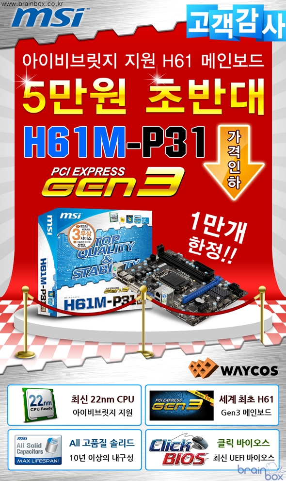 세계 정상급 토탈 IT 솔루션 제조사, MSI의 한국 공식 디스트리뷰터인 ㈜웨이코스(대표:고민종)가 MSI 메인보드를 사랑해주시는 한국 소비자들을 위하여 1만개 한정으로 MSI H61-P31 Gen3 메인보드를 5만원 초반대의 인하된 가격에 특별 판매를 실시한다.