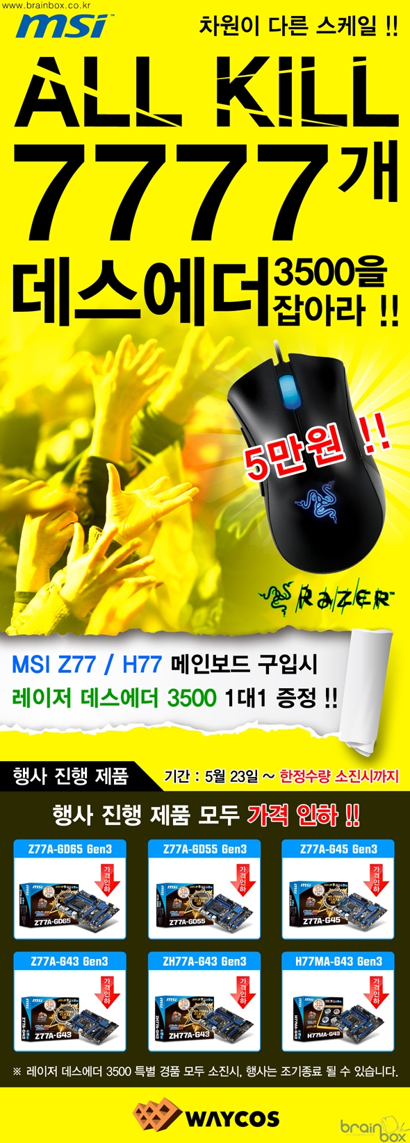 세계 정상급 토탈 IT 솔루션 제조사, MSI의 한국 공식 디스트리뷰터인 ㈜웨이코스(대표:고민종)가 MSI 코리아와 함께 MSI 메인보드를 사랑해주시는 한국 소비자들을 위하여 총 7777명의 고객에게 고성능 게이밍 마우스인 “데스에더 3500”을 증정하는 행사를 실시한다고 밝혔다.