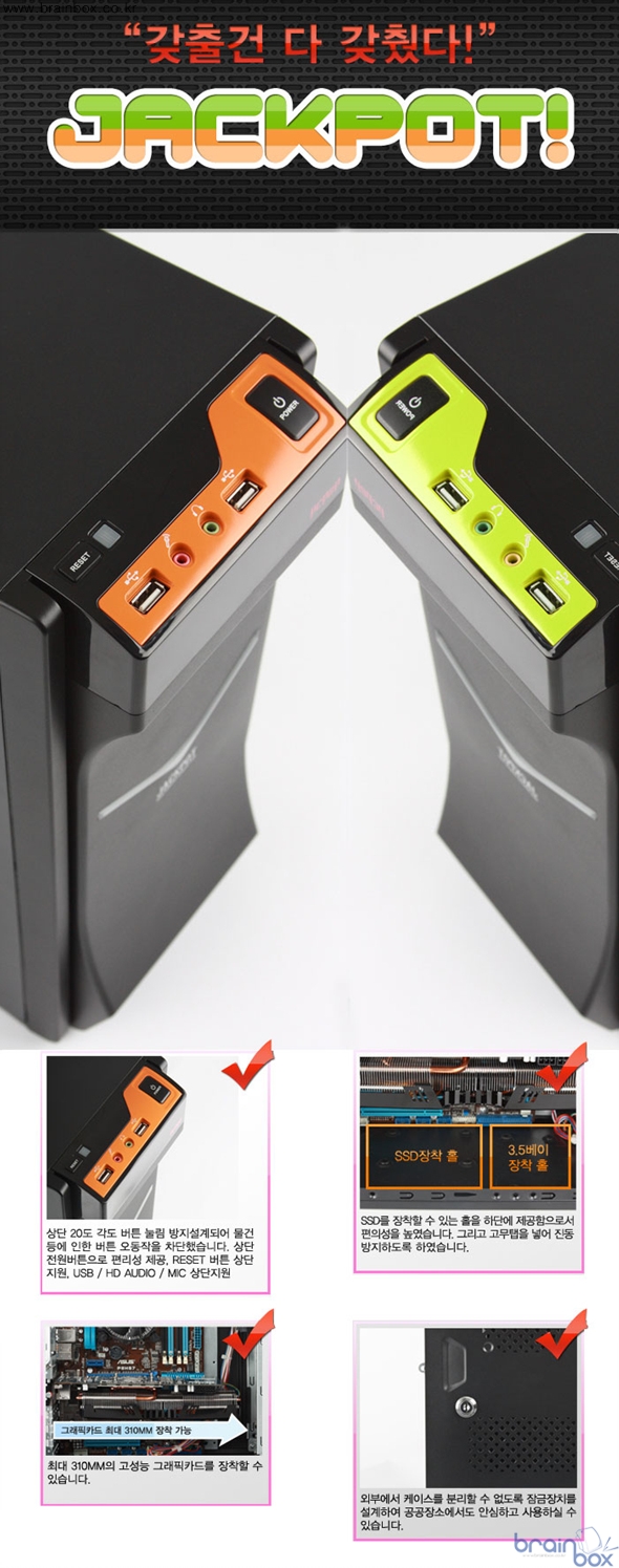 피씨팝컴퍼니에서 PC용 케이스 잭팟을 출시한다고 전했다. 잭팟은 오렌지와 그린, 두가지 컬러로 나뉘어 판매된다. 잭팟은 전면 상단에 배치된 버튼 및 단자에 약 20도의 기울기를 적용해 물건 등을 얹어도 버튼이 눌리지 않도록 차단했다. 버튼 및 단자 배치는 Power / RESET / USB / HD AUDIO / MIC 구성이 제공된다. 전면에는 v형 램프에 LED 3개가 적용이 되어 고급스러운 PC카페 분위기를 연출하는 동시에 대부분 컴퓨터가 모니터 뒤에 있는 경우가 있어 제품 동작유무를 알 수가 없는 불편함을 개선, 편리함을 추구했다. ![]() 내부 구성은 최대 310mm 크기의 그래픽 카드까지 지원하며, 후면 80mm팬을 기본 장착하여 출하되기 때문에 내부의 발열을 신속하게 배출할 수 있도록 돕는다. 또한 최근 인기를 모으고 있는 SSD 장착 홀을 별도로 제공하고 있으며, 각 홀마다 제품 보호 및 진동소음을 방지하기 위한 고무탭을 장착해 사용자 편의성을 향상시켰다. PC방에서 자주 사용되는 백업용 전원 커넥터 및 S-ATA 케이블의 경우, 기존에는 PCI 슬롯으로 빼내어 날카로운 모서리에 피복이 벗겨지는 등 합선 위험에 노출되어 있었다. 하지만 잭팟은 별도의 PC방용 홀을 제공해 편리한 유지 관리를 편리하게 할 수 있도록 힘썼다. 3.5인치 드라이브 베이는 여유있는 아래쪽부터 밀어서 장착하게 되어 있으며, 케이스를 수평으로 눕혀놓고 조립 시 왼손으로 저장장치를 밀어 넣고 오른손으로 전동기구등을 써서 간편하고 빠른 조립을 실현시켰다. 케이스는 공기역학적인 CAG 1.1규격에 맞춰 설계해 전면과 측면으로 시원한 공기를 흡입해 그래픽카드 / CPU / 파워 서플라이의 발열을 최소화 했으며, 후면에 배기 쿨러가 장착되어 뜨거운 열기를 신속하게 배출한다. 후면에는 마우스와 키보드 도난 방지 탭을 제공 하여 PC방이나 데모시스템 제작시 분실을 방지 했으며, 사이드 패널에 잠금장치를 설치해 임의로 열 수 없도록 설계되었다. 케이스의 크기도 175mm X 405mm X 370mm (W x H x D)로 협소한 공간에서도 편리하게 설치할 수 있도록 고려했다. |