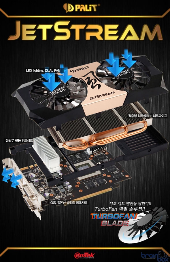 - 4+2 페이즈 DrMOS PWM으로 전원 공급 회로 강화한 커스텀 디자인 지포스 GTX 670 국내 컴퓨터 그래픽카드 시장을 선도하고 있는 (주)이엠텍아이엔씨(대표:이덕수)는 오버클럭으로 성능 향상을 꾀하고 듀얼팬 쿨러로 냉각력을 높인 하이엔드 그래픽카드 <PALIT GeForce GTX 670 JetStream>을 출시하였다.