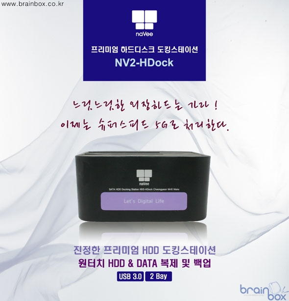 디지털 전문 브랜드 naVee(나비)에서 SATA 하드디스크 도킹스테이션 NV2-HDock를 출시 했다. NV2-HDock은 슈퍼스피드 USB3.0 인터페이스를 지원하여 5Gbps의 전송속도로 PC와 데이터를 주고 받을 수 있으며, SATA I/II/III를 지원하는 모든 2.5인치 HDD와 SDD 그리고 3.5인치 HDD를 지원한다. HDD의 용량은 3테라까지 지원이 가능하고 PC와 연결하지 않아도 독립적으로 HDD를 복제할 수 있는 기능을 지원하여 OS가 포함된 HDD도 간편하게 버튼을 누름 으로서 원본 HDD를 새로운 HDD로 똑같이 복제할 수 있다 복제 속도는 1분에 3.2G씩 복제가 가능하다.