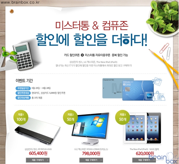 이번 행사는 삼성 샌디브릿지 탑재 15인치 노트북 100개, LG 23인치 올인원PC 50대, 뉴아이패드 16GB 50개에 한해서 진행되며 미스터통에서 삼성, 현대카드 5천원 할인쿠폰을 발급받을 수 있다. 컴퓨존 기획부 김대호 팀장은 “이번 이벤트는 삼성, 현대카드 5천원 할인쿠폰 제공은 물론 KCP 결제를 이용하는 모든 가맹점에게 발급되는 카드사 할인쿠폰 등도 중복 사용할 수 있다. ”라며 “제일 잘나가는 IT 기기 구매를 고민하셨다면 이번 기회에 할인에 할인을 더한 혜택을 받으실 수 있는 이벤트이므로 많은 관심 부탁드린다”라고 말했다.