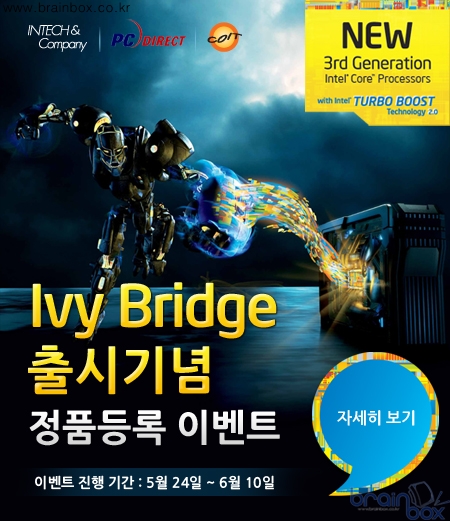 리얼 CPU 사이트에 접속하면 현재 아이비브릿지 출시기념 정품 등록 이벤트를 6월 10일까지 진행을 한다. 신형 프로세서인 아이비브릿지를 구입한 후 정품 등록을 한 고객들을 대상으로 푸짐한 경품 행사를 진행한다고 한다. 자세한 내용은 해당 페이지를 통해 확인할 수 있다.(www.realcpu.co.kr) |