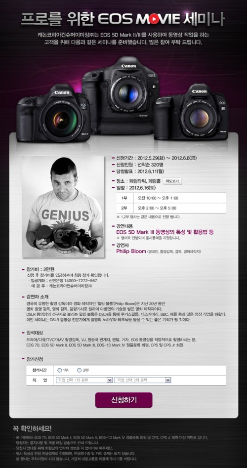 이번 세미나는 직업 영상 전문가를 포함해 캐논의 DSLR 카메라 4종(▲EOS 5D Mark2, ▲EOS 5D Mark3, ▲EOS EOS-1D Mark4 ▲EOS 7D)을 사용하는 정품등록 회원이라면 참여 신청을 할 수 있다. (CPS, CPS Jr. 회원은 사용 기종 상관없이 신청 가능) 참여 신청은 6월 8일(금)까지 캐논코리아컨슈머이미징 공식 홈페이지(www.canon-ci.co.kr)내 이벤트 페이지에서 가능하다. 당첨자는 6월 11일(월) 홈페이지 공지사항을 통해 발표될 예정이다. 당첨자는 참가비 2만원을 입금해야 최종으로 참가가 확인된다.