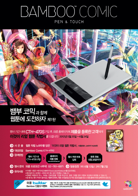 이와 함께 와콤은 '와콤 트위터 Bamboo Comic 인증샷 이벤트'를 진행한다. 제품 구매 후, 제품 사진을 찍어 와콤 트위터(@wacomkorea)로 인증샷을 올린 참가자들에게는 음료 기프티콘을 증정하는 것.