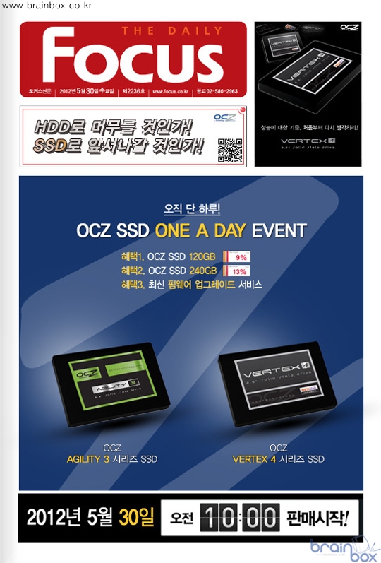 - 5월30일, OCZ 어질리티3, 버텍스4 11번가 할인 이벤트. 이번 할인행사 제품으로는 국내 가격비교 사이트인 다나와와 네이버 지식쇼핑에서 모두 인기순위 1위에 오른 ‘어질리티3(Agility3)’와 OCZ社의 주력 제품으로 최근 출시와 함께 인기몰이 중인 ‘버텍스4(Vertex4)’ SSD 제품이다.
