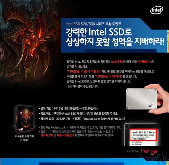 IT 전문기업 디지털헨지(대표 정성환)는 인텔 SSD 520/330 시리즈 구매자를 대상으로 디아블로3 이벤트를