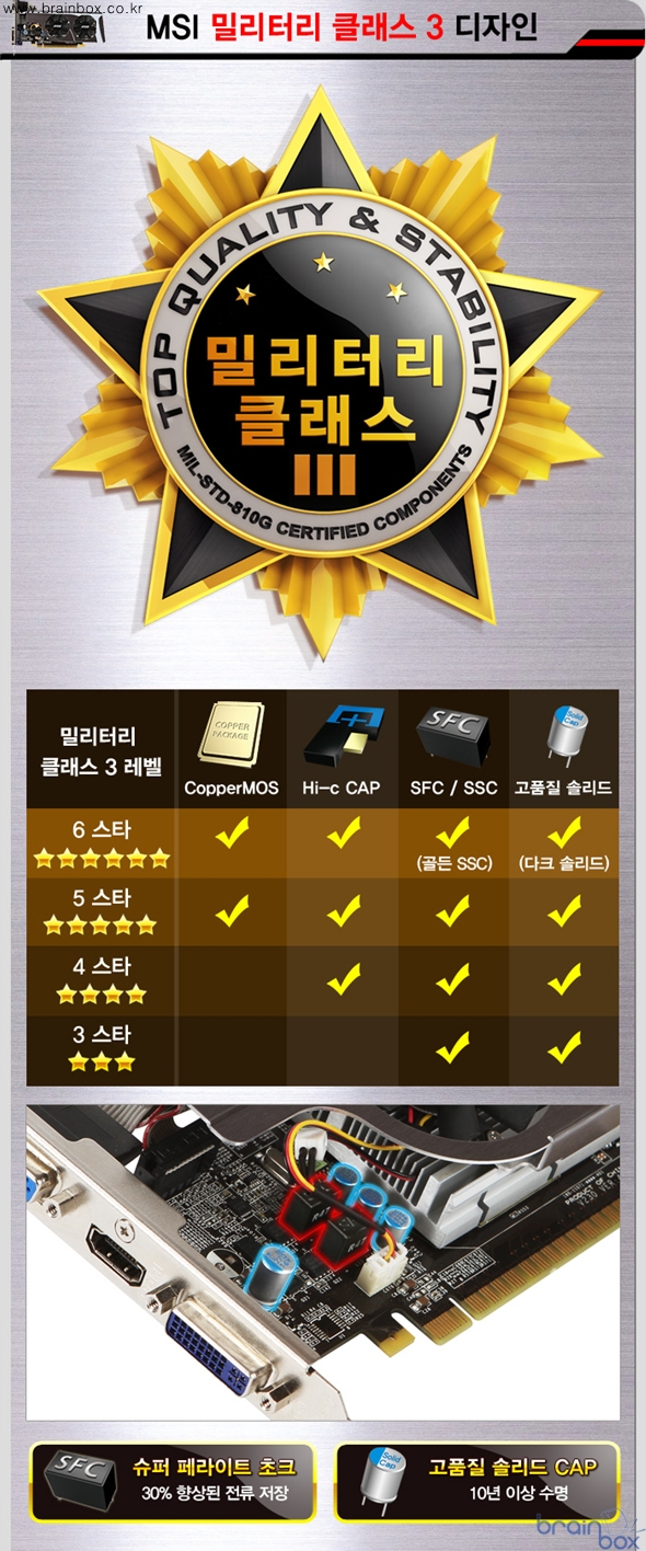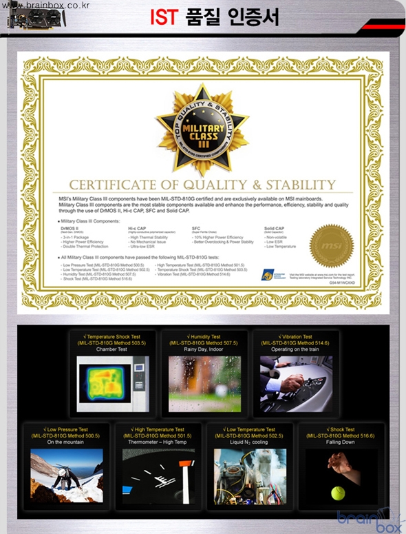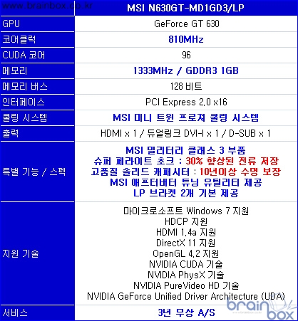 | - MSI 미니 트윈 프로져, 단일 팬 제품보다 강력한 쿨링 성능 제공 - 더욱 강력해진 품질, MSI 밀리터리 클래스 3 디자인 - 네이티브 HDMI 1.4a 지원, 1080P HD 영화 재생 및 TrueHD / DTS-HD 오디오 전송 ![]() 세계 최고의 VGA 제조 기술력을 갖춘, MSI의 한국 공식 디스트리뷰터인 ㈜웨이코스(대표:고민종)가 NVIDIA 지포스 GT 630 코어를 장착하고 MSI 미니 트윈 프로져 쿨러를 탑재한 “MSI N630GT-MD1GD3/LP” 그래픽 카드를 출시했다. MSI 미니 트윈 프로져 쿨러, 레퍼런스 보다 강력한 쿨링 성능 제공 ![]() MSI N630GT-MD1GD3/LP 제품은 MSI 고유의 “미니 트윈 프로져 (Mini Twin Frozr)” 쿨러를 채택하여 더욱 시원한 쿨링 성능을 제공한다. 레퍼런스 제품과 달리 쿨링 팬을 2개 장착하여 2배 더 많은 풍량을 제공하기 때문에, 그래픽 카드의 발열량을 더욱 빠르고 시원하게 제거할 수 있다. 더욱 강력해진 품질, MSI 밀리터리 클래스 3 디자인 ![]() MSI N630GT-MD1GD3/LP 제품은 더욱 우수한 품질을 제공하기 위하여, 밀리터리 클래스 3 디자인을 적용하였다. 본 제품에 장착된 SFC (슈퍼 페라이트 초크) 는 기존 초크보다 30% 향상된 전류 저장능력 및 오버클러킹 환경에서도 안정적인 전원을 공급할 수 있는 특징을 제공한다. 아울러 전체 기판에 사용된 고품질 솔리드 캐패시터는 풀로드 상태를 기준으로 10년이라는 긴 수명을 제공하여, ESR 특성 부분에서도 기존 솔리드 캐패시터보다 30% 낮은 특성을 제공한다. ![]() ※ 밀리터리 클래스 3 부품이 통과한 테스트 (MIL STD는 미 국방성 통과 기준) - 습도 테스트 (Humidity Test) : (MIL STD 810G Method 507.5) - 저압 테스트 (Low Pressure Test) : (MIL STD 810G Method 500.5) - 고온 테스트 (High Temperature Test) : (MIL STD 810G Method 501.5) - 저온 테스트 (Low Temperature Test) : (MIL STD 810G Method 502.5) - 온도 충격 테스트 (Temperature Shock Test) : (MIL STD 810G Method 503.5) - 진동 테스트 (Vibration Test) : (MIL STD 810G Method 514.6) - 충격 테스트 (Shock Test) : (MIL STD 810G Method 516.6) MSI 밀리터리 클래스 3 디자인에 속한 부품들은 우수한 품질과 내구성으로, IST (Integrated Service Technology) 그룹의 공식 인증서를 발급 받았다. IST 는 다양한 하드웨어 제품의 품질과 안전성을 테스트하는 전문 연구기관으로, 습도 / 고온(발열) / 충격 / 진동 등의 다양한 테스트를 미 국방성이 제시한 기준과 동일하게 진행하여 이를 통과한 제품 및 부품에 대해서 품질 인증서를 발급하게 된다. 네이티브 HDMI 1.4a / 1080P 블루레이 및 HD DVD 지원 / DTS-HD 오디오 전송 지원 ![]() MSI N630GT-MD1GD3/LP 제품은 네이티브 HDMI 1.4a를 통해 1080P HD급 고해상도를 지원하는 블루레이 HD DVD를 지원하며, DTS-HD 오디오 전송도 지원하여 멀티미디어 HTPC 구성에 적합한 특징을 가지고 있다. MSI N630GT-MD1GD3/LP 공식 스펙 ![]() MSI 공식 한국 디스트리뷰터인 ㈜웨이코스가 국내에 유통하는 MSI 그래픽카드는 타사 저가형 VGA 와 차별화된 3년 무상 A/S 를 제공하며, 더욱 자세한 내용은 웨이코스 홈페이지를 참조하면 된다. |