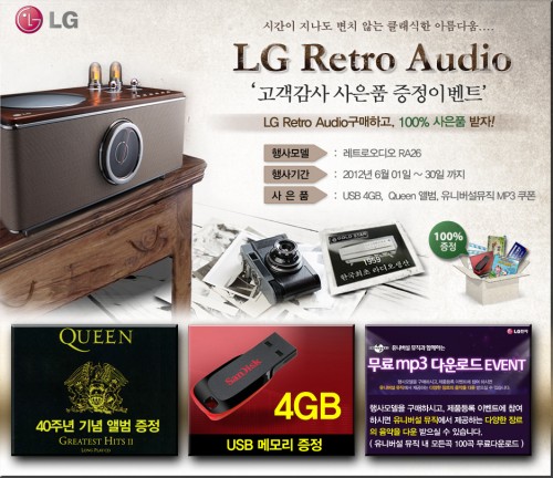 이벤트는 6월 한달간 모든 오픈마켓에서 진행하며, LG 레트로오디오 RA26을 구매하는 사람들에게 USB 4GB 메모리, 퀸 40주년 기념앨범, 유니버셜뮤직 MP3 쿠폰을 모두 증정한다.