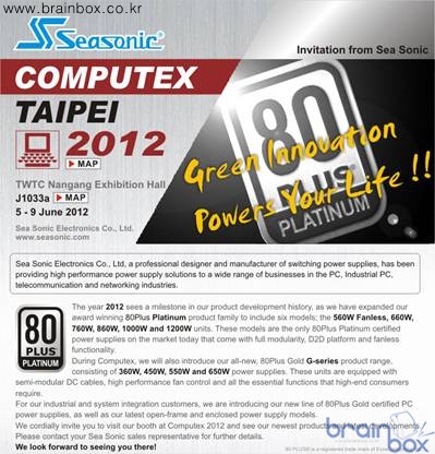 공개한다. 지난 2월 국내에도 출시된 시소닉의 최상위 제품군인 80Plus 플래티넘 인증의 ‘시소닉 P 시리즈’는 860W와 1000W에 이어 새로운 660W, 760W, 1200W 라인업이 컴퓨텍스를 통해 전시되며, 팬 작동 없이 완전 무소음을 구현한 팬리스 제품인 시소닉 P-560 Fanless 80Plus Platinum도 함께 공개된다. 새로운 라인업인 ‘시소닉 G 시리즈’도 세계 최초로 공개된다. 시소닉 G 시리즈는 80Plus 골드 등급 인증의 뛰어난 효율과 세미 모듈러 케이블 방식으로 뛰어난 가격대 성능비를 가진 모델로, 360W, 450W, 550W, 650W 네 모델이 전시될 계획이다. 해당 신제품들의 자세한 성능 정보와 외관, 출시일은 컴퓨텍스 2012 개막과 함께 공개될 예정이다. ![]() 세계 최초로 80Plus 인증 제품을 선보인 제조사이기도 한 시소닉은 현재 전 제품 80Plus 인증을 통해 친환경 컴퓨팅 환경 구현에 앞장 서고 있으며, 국내 공식 수입 유통사인 ㈜지엠코퍼레이션(www.gmc.co.kr)을 통해 제품군이 선보여지고 있다. 현재 국내 시장에는 일반형 케이블 제품인 ‘시소닉 S12II 80Plus 브론즈 시리즈’, 세미 모듈러 제품인 ‘시소닉 M12II 80Plus 브론즈 시리즈’, 고급형 풀모듈러 제품군인 ‘시소닉 X 80Plus 골드 시리즈’와 ‘시소닉 X Fanless 80Plus 골드 시리즈’, 최고급 제품인 ‘시소닉 P 80Plus 플래티넘 시리즈’가 판매 중이며, 새로운 라인업인 ‘시소닉 G 80Plus 골드 시리즈’, ‘시소닉 ECO 80Plus 브론즈 시리즈’도 올해 중 출시될 예정이다. ![]() |