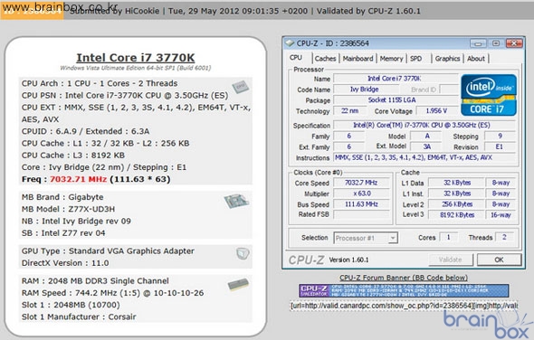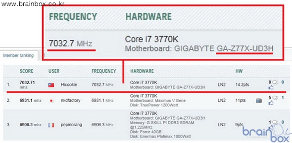 이번 7.03GHz 클럭 스피드는 액체 질소를 통한 익스트림 쿨링 환경에서 달성된 기록((5월 30일 현재 기준)으로, 기가바이트에서 2012년 All 디지털 전원부 엔진과 3D BIOS, 3D Power 그리고 Ultra Durable4등 다양한 최신 기술을 적용한 인텔 Z77 히트 모델인 GA-Z77X-UD3H 블랙 에디션 메인보드를 통해 달성이 되었다.
