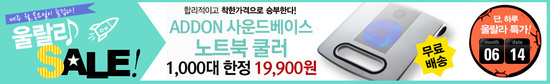 옥션에서 6월 14일 오전 10시부터 울랄라세일 9탄으로 ADDON 사운드베이스 노트북 쿨러를 1,000대 한정으로 10만원 할인된 가격(129,000원 -> 19,900원)에 특가 판매한다.