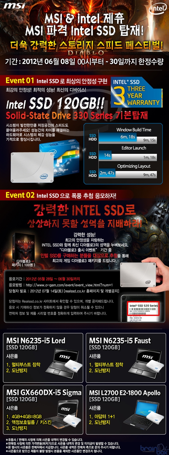 인텔에서 제공되는 SSD 330 Series 120GB(최대 읽기 500MB/s, 쓰기 450MB/s)는 MSI 게이밍 시리즈 노트북에 최적화가 가능하며, 뛰어난 안정성과 완벽한 호환성, 동일 사양대비 최대 5배 이상 퍼포먼스를 제공한다. 인텔 330 330 Series 120GB 탑재 대상 모델은 아래와 같다. 인텔은 이번 신규 SSD 출시와 더불어 디아블로3 출시를 기념하기 위해 6월 한달 동안 SSD 330 Series 120GB 구매자 대상으로 추첨을 통해 디아블로3 패키지를 제공하는 이벤트를 진행하고 있으며, 제품 구매자는 RealSSD에 접속하여 사용하고 있는 SSD의 시리얼 번호를 기재하면 추첨을 통해 디아블로3 패키지를 증정한다. 엔씨디지텍 세일즈 담당자는, “ 엔씨디지텍과 디지털헨지의 제휴를 통해 더욱 강력한 퍼포먼스를 제공할 수 있는 노트북을 점진적으로 양산할 수 있을 것으로 기대한다. 고성능 랩탑PC에 대한 소비자들의 니즈를 수용함으로써 성능으로 보다 실질적인 신뢰도를 주는데 더욱 정진할 것이다.” 라고 말했다. 이번 이벤트 대상모델인 프리미엄 N6235-i5 Lord (SSD 120GB)모델과 N6235-i5 Faust (SSD 120GB)모델, 그리고 게이밍 노트북 GX660DX-i5 Sigma (SSD 120GB)모델은 온라인 쇼핑몰, 가격비교사이트 및 엔씨디지텍 홈페이지를 통해 확인이 가능하며, 제품구입에 대한 더 자세한 사항은 MSI 노트북 공식 유통사인 엔씨디지텍으로 문의하면 된다. |