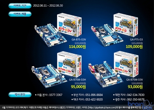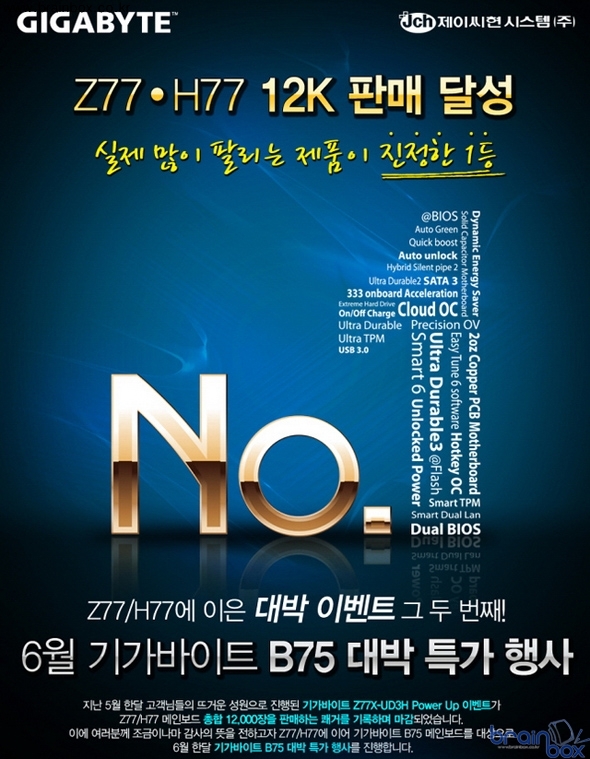 GIGABYTE Technology Co., LTD (이하 기가바이트)의 국내 공식 수입유통사인 제이씨현시스템(주)(대표:차현배)에서 진행한 기가바이트 Z77X-UD3H Power Up 이벤트가 Z77/H77 총합 12,000장을 판매하는 쾌거를 기록해 이에 감사의 뜻을 전하고자 6월 한달 "기가바이트 B75 대박 특가 행사"를 진행한다 밝혔다. "기가바이트 B75 대박 특가 행사"는 5월 기가바이트 Z77/H77 12,000장 판매고를 일으킨 Z77X-UD3H Power Up 프로모션에 이은 2번째 대박 이벤트로써, 6월 한달 간 PC방에서 선호하는 기가바이트 B75-D3V, P75-D3, B75M-D3H, B75M-D3V 총 4개 제품에 대해 약 5~20% 할인된 특가로 전국 주요 온/오프라인 쇼핑몰 및 PC 판매점을 통해 진행된다.