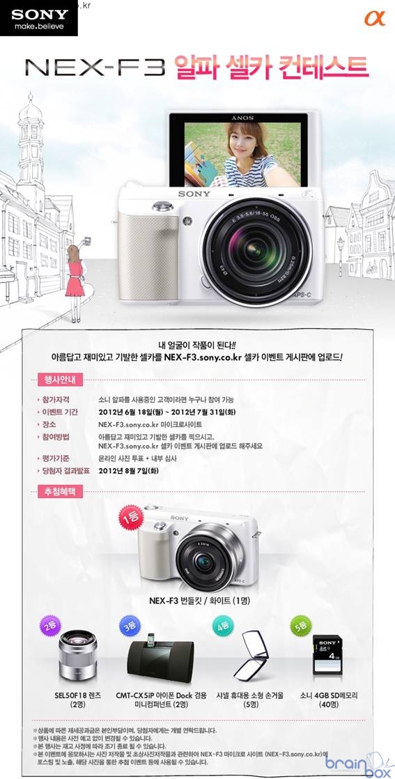 기념, 7월 31일까지 접수 - 최고의 셀카 사진 선정해 총 NEX-F3 카메라, 미니 콤포넌트 등 총 50명에게 풍성한 사은품 증정 소니코리아(대표 이토키 기미히로)는 고화질의 아름다운 셀카 촬영이 가능한 미러리스 카메라 ‘알파 NEX-F3’ 출시를 기념해 ‘알파 셀카 콘테스트’를 진행한다고 18일 밝혔다. 이번 콘테스트는 셀카를 자주 찍는 고객에게 특별한 즐거움을 선사하고자 마련했으며, 알파 시리즈 카메라 사용자면 누구나 참여 가능하다. 참여를 희망하는 고객은 재미있는 아이디어와 밝은 표정이 살아있는 셀카 사진을 7월 31일까지 알파 NEX-F3 마이크로 사이트에 올리면 된다. ![]() 소니는 셀카 콘테스트에 많은 사진 애호가들이 참여할 수 있도록 사은품도 풍성하게 준비했다. 1등 1명에게는 NEX-F3 번들킷 화이트 제품이 부상으로 수여되며, 2등 2명에게 알파 SEL50F18 렌즈, 3등 2명에게 CMT-CX5iP 아이폰 독(Dock) 겸용 미니 콤포넌트를 증정한다. 이 외에도 샤넬 휴대용 손거울, 소니 SD메모리(4GB) 등 총 50명을 위한 다양한 선물들이 마련되어 있다. 최고의 셀카 사진 결과는 온라인 투표와 사내외 사진 전문가들의 의견을 종합해 8월 7일 NEX-F3 마이크로 사이트를 통해 발표될 예정이다. 한편, 지난 23일에 출시한 미러리스 카메라 알파 NEX-F3는 1610만 화소의 엑스모어(Exmor)TM APS HD CMOS 센서를 탑재해 아웃포커싱 효과 등 DSLR과 동등한 수준의 선명하고 정교한 사진과 초고화질의 풀HD 동영상(60i/24p) 촬영이 가능하다. 특히 180도까지 각도 조절이 가능한 플립 LCD를 채택해 직접 자신의 모습을 확인하며 셀카 촬영을 할 수 있을 뿐만 아니라, ‘스마일 셔터 기능’을 통해 웃는 얼굴 그대로의 자연스러운 모습이 저절로 찍히는 등 여성 사용자들이 선호하는 아름다운 셀카 촬영에 특화된 기능들을 많이 탑재하고 있다. ![]() 또한 ‘소프트 스킨 기능’을 통해 인물사진 촬영 시, 카메라가 자동으로 인물을 화사하게 밝혀 피부의 잡티를 최소화 시킴으로써 깨끗하고 만족스러운 이미지 결과물을 선사한다. 여기에 DSLT-A57에 이어 미러리스 카메라 최초로 탑재된 ‘자동 인물 프레이밍(Auto Portrait Framing)’ 기능은 여성 초보 사용자들도 손쉽게 최적화된 구도를 갖춘 인물 사진을 찍을 수 있도록 지원한다. 소니코리아 관계자는 “여성 카메라 사용자가 증가하면서 셀카에 대한 빈도와 중요도도 커지고 있다”며 “이번 콘테스트를 통해 자신의 모습을 보면서 고화질의 셀프 촬영을 할 수 있는 NEX-F3에 대한 정보도 알고, 풍성한 사은품도 함께 받아가실 수 있는 기회가 되었으면 좋겠다”고 말했다. |