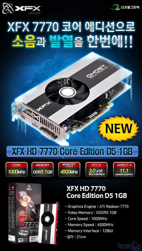 ![]() 세계 최고의 품질을 자랑하는 XFX 그래픽카드의 국내 공식 디스트리뷰터인 디지탈그린텍㈜(대표 이주영)은 고성능 쿨링시스템을 탑재한 [XFX HD7770 D5 1GB Core Edition]을 출시한다. [XFX HD7770 D5 1GB Core Edition]에 에 탑재된 AMD 라데온 HD7770 GPU는 28nm의 신공정과 GCN(Graphics Core Next) 아키텍쳐 그래픽 엔진, 640개의 스트림프로세서를 통해 강력하면서도 사실적인 3D 그래픽성능을 통해 수준높은 게임환경을 제공한다. 또한, 설정된 전력한도 내에서 클럭을 자동으로 컨트롤하여 성능을 높일 수 있도록 하는, AMD 파워튠(Power Tune) 기술과 유휴상태에서 3W미만의 전력만 사용하는 제로코어 파워 (ZeroCore Power) 기술을 통해 전력 관리기술에 있어서의 큰 발전을 이루었다. 이런 기술들이 적용된 [XFX HD7770 D5 1GB Core Edition]의 최대 전력소모량은 80W에 불과하며, 그 결과 발열과 소음을 크게 줄이고 사용기간이 길어질수록 전력소모량에 따른 유지비용이 감소되는것이 특징이다. ![]() 특히, [XFX HD7770 D5 1GB Core Edition]에는 기존 출시된 HD7900시리즈를 통해 공개된 쿨링관련 기술들이 적용되었는데, 대표적으로 고스트 서멀 테크놀러지(Ghost Thermal Technology)와 Dust-Proof Fan이 그것이다. 고스트 서멀 테크놀러지는 공기흐름을 극대화하는 개방형 팬커버를 채택하여, 그래픽카드의 발열을 빠르게 외부로 배출하며 더 낮은 온도와 소음을 유지할 수 있도록 한 XFX 고유의 기능이며, Dust-Proof Fan은 쿨링팬 내부에 먼지유입을 방지하는 2중 차폐구조를 채택, 최대 10,000시간까지 팬 수명을 늘렸다. 이러한 신기술의 적용으로 [XFX HD7770 D5 1GB Core Edition]는 고성능 그래피카드의 단점인 소음과 발열을 획기적으로 개선하여, 사용자로 하여금 큰 만족감을 제공한다. 디지탈그린텍㈜ 마케팅 담당자는 "[XFX HD7770 D5 1GB Core Edition]는 XFX 그래픽카드 특유의 고급스러운 디자인과, 앞선 기술력을 만끽 할 수 있는 제품으로, 특히 그래픽카드의 소음과 발열에 민감한 소비자 분들께 최고의 선택이 될 것으로 기대한다." 고 밝혔다. [XFX HD7770 D5 1GB Core Edition]는 국내 공식 디스트리뷰터인 디지탈그린텍㈜을 통해 3년간 무상보증서비스를 제공받을 수 있으며, 제품에 대한 자세한 문의는 디지탈그린텍㈜ 영업부 (02-715-9327) 를 통해 가능하다. |