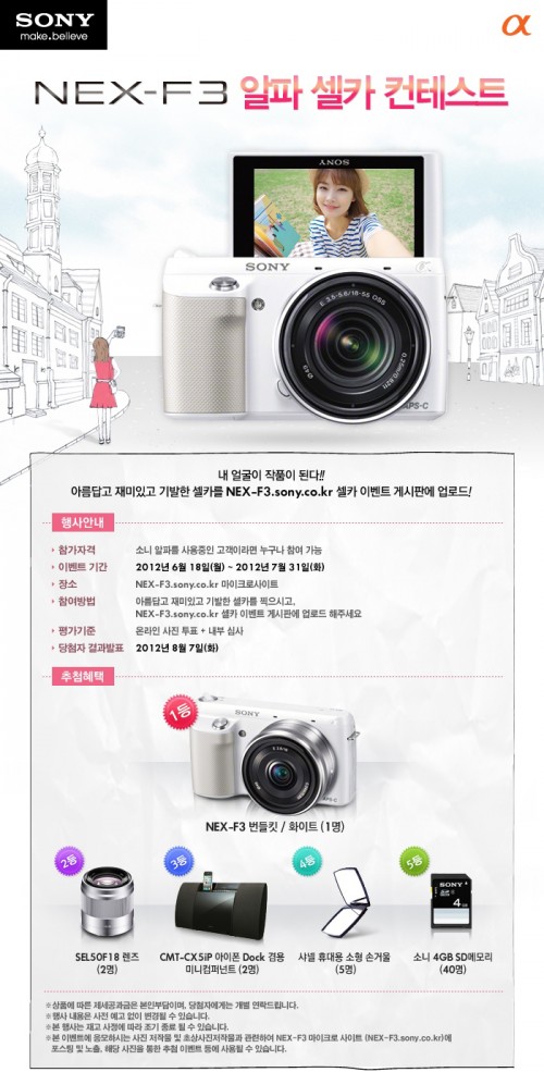 이번 콘테스트는 셀카를 자주 찍는 고객에게 특별한 즐거움을 선사하고자 마련했으며, 알파 시리즈 카메라 사용자면 누구나 참여 가능하다. 참여를 희망하는 고객은 재미있는 아이디어와 밝은 표정이 살아있는 셀카 사진을 7월 31일까지 알파 NEX-F3 마이크로 사이트(NEX-F3.sony.co.kr)에 올리면 된다.